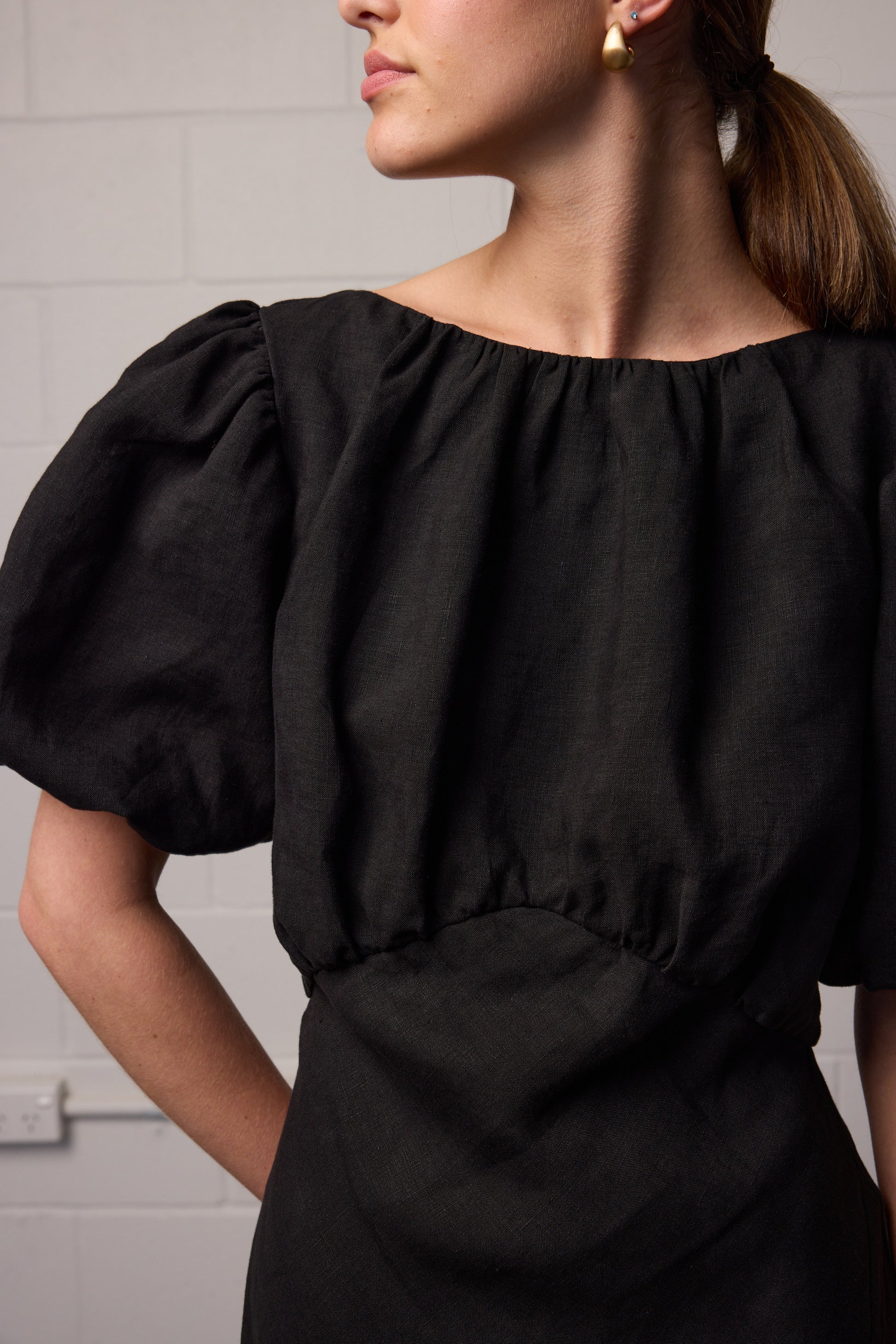 • Short gathered puff sleeves